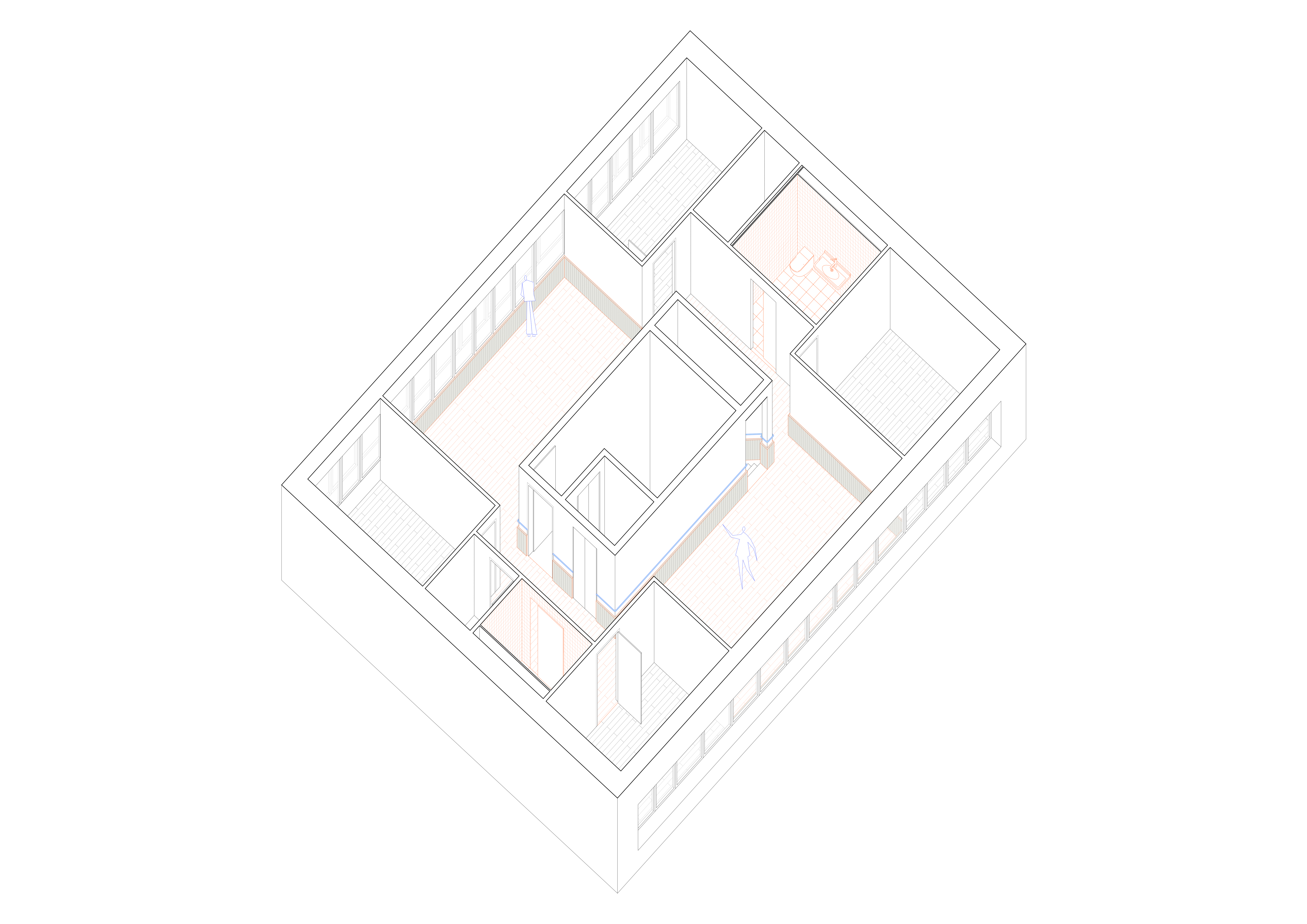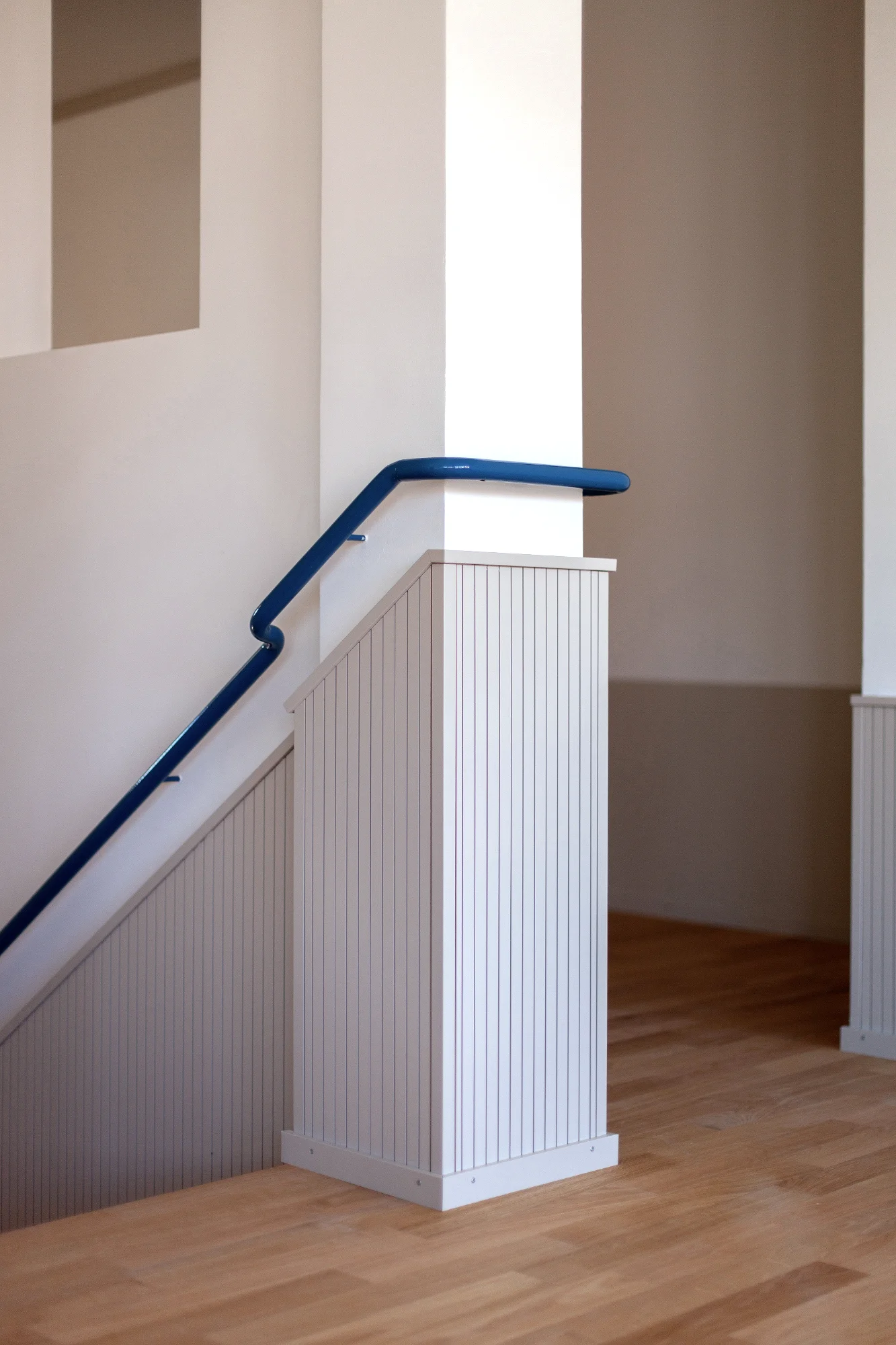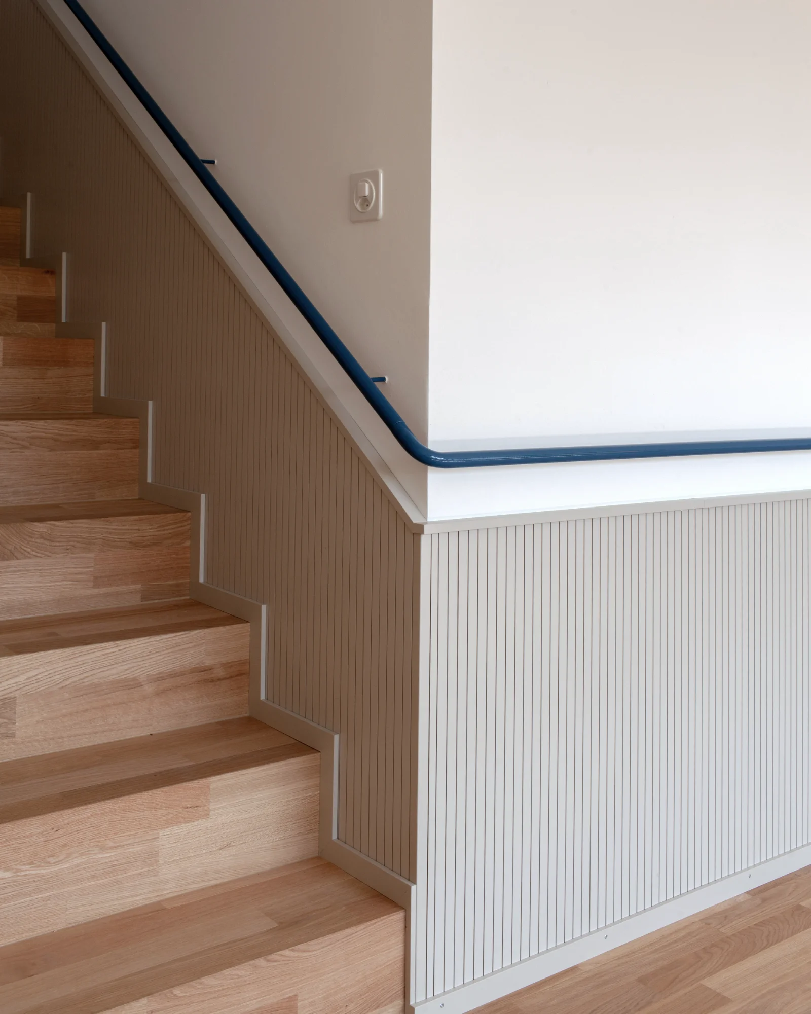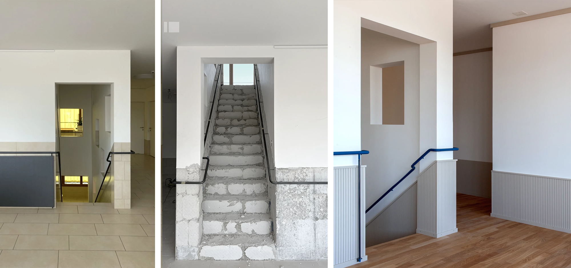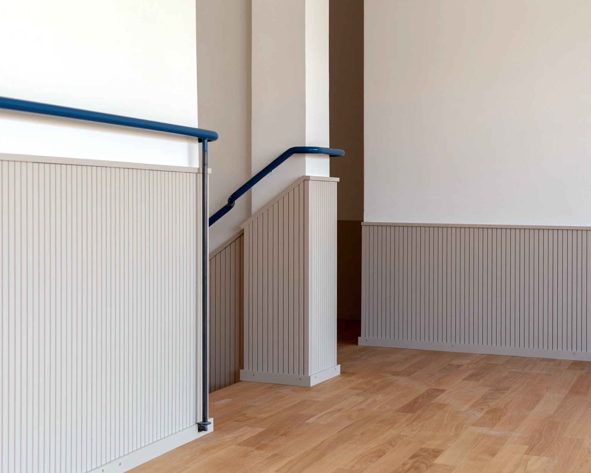 Gestalterisch liegt der Fokus auf der Verbesserung der Wohnqualität. In den vier Wohngeschossen wird überprüft, wie sich durch neue Boden- und Wandmaterialien sowohl die Raumakustik als auch die Wohnlichkeit spürbar steigern lassen. Zum Einsatz kommen akustisch wirksame Lamperien, ein geölter Eichenparkett und ruhige, unaufgeregte Farbwelten. Beim Farbkonzept wurde besonders auf die Bedürfnisse des beeinträchtigten Klientels Rücksicht genommen – klare Orientierung, geringe Reizbelastung und ein stimmiges Gesamtbild standen dabei im Vordergrund. Durch geringfügige strukturelle Anpassungen wird im fünften Obergeschoss ein neu konzipierter Wellnessbereich realisiert, der als ruhiger Rückzugsort Raum für Erholung und persönliche Auszeiten schafft.