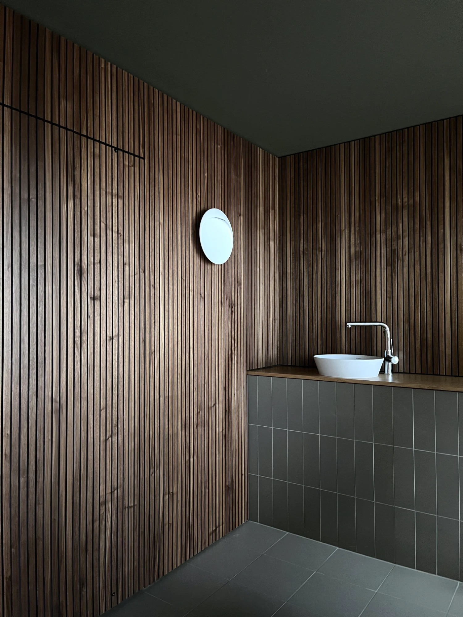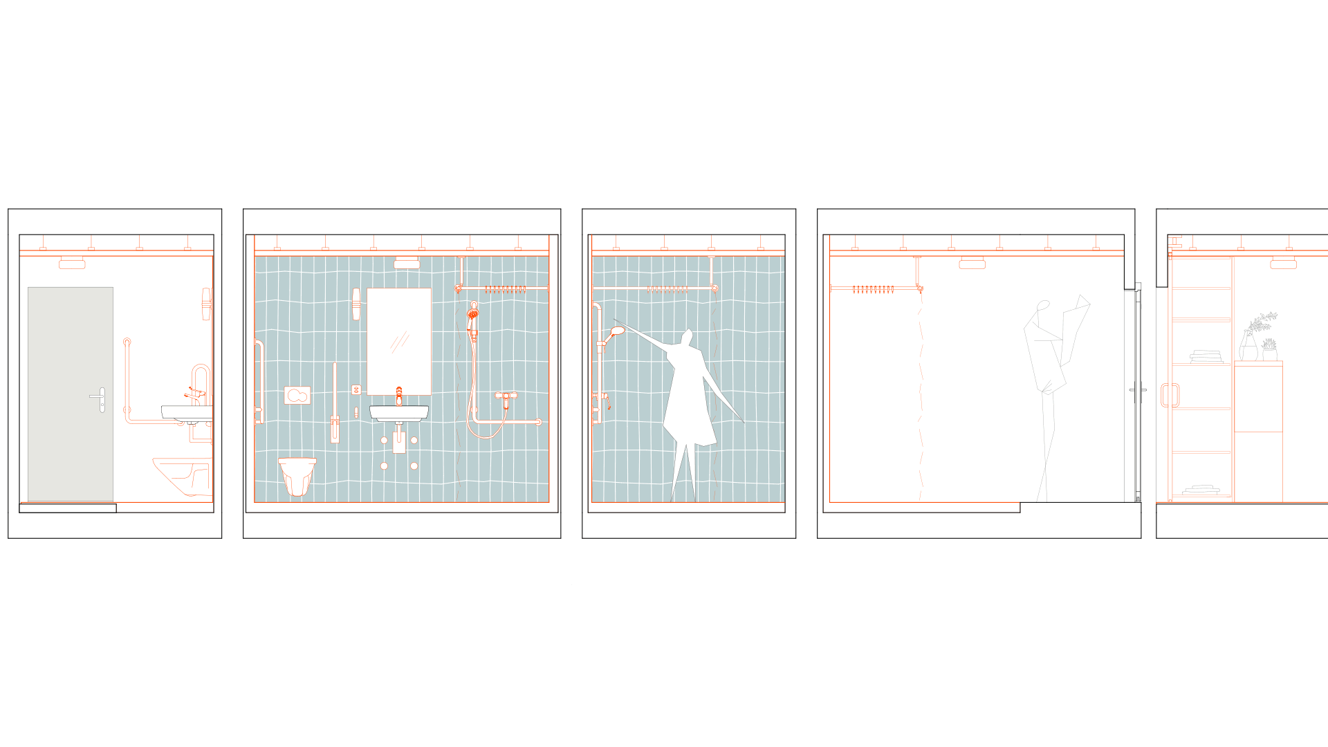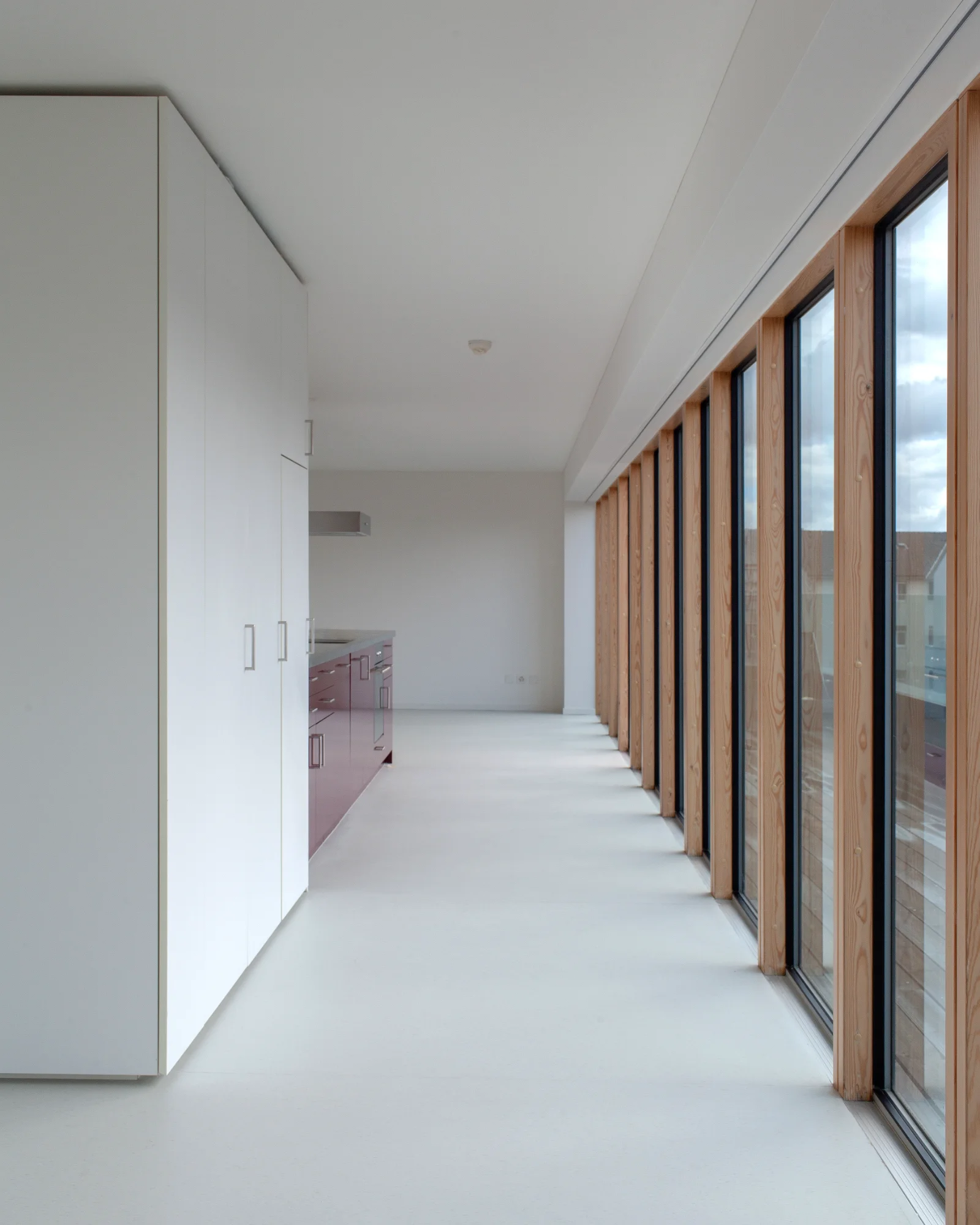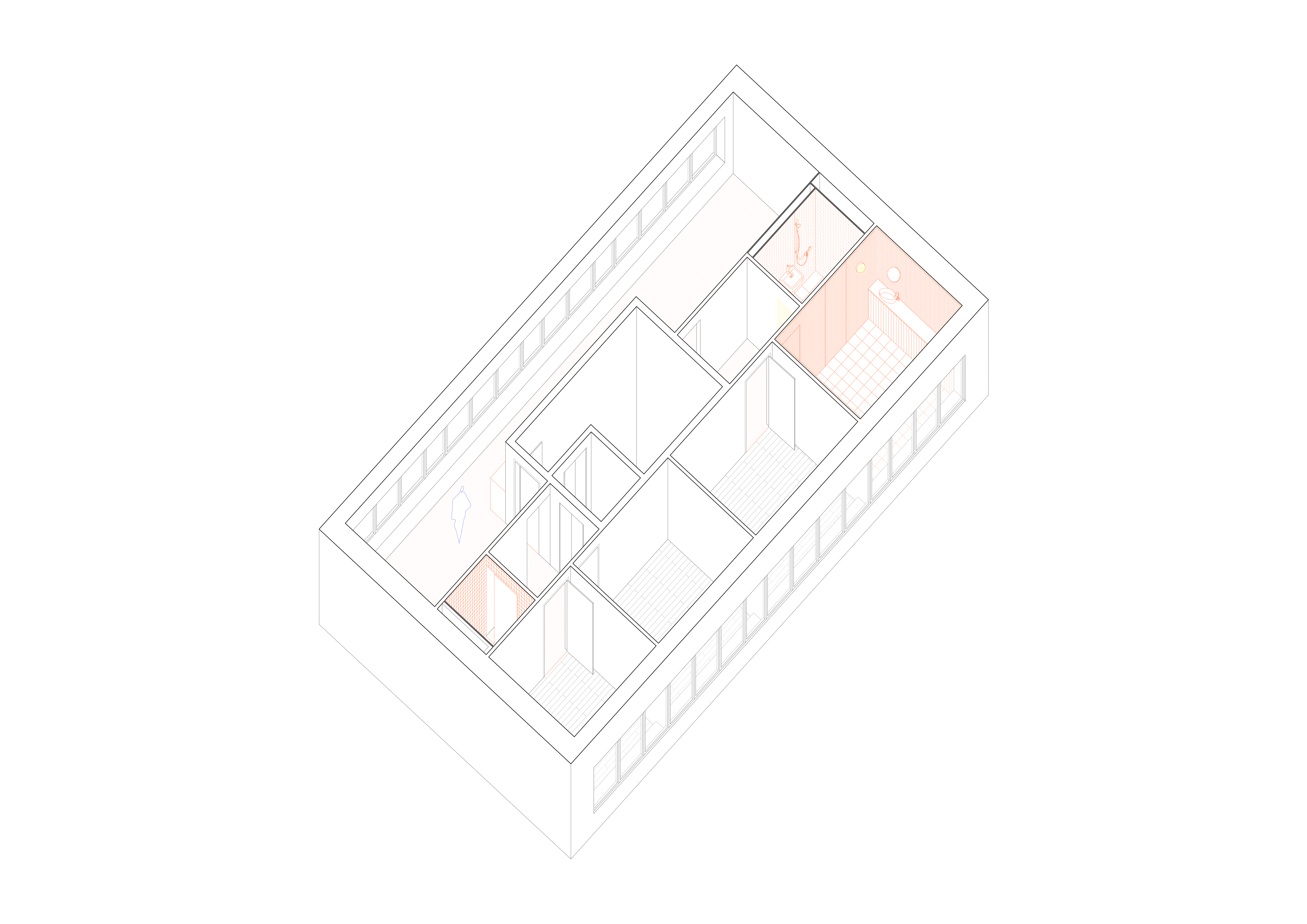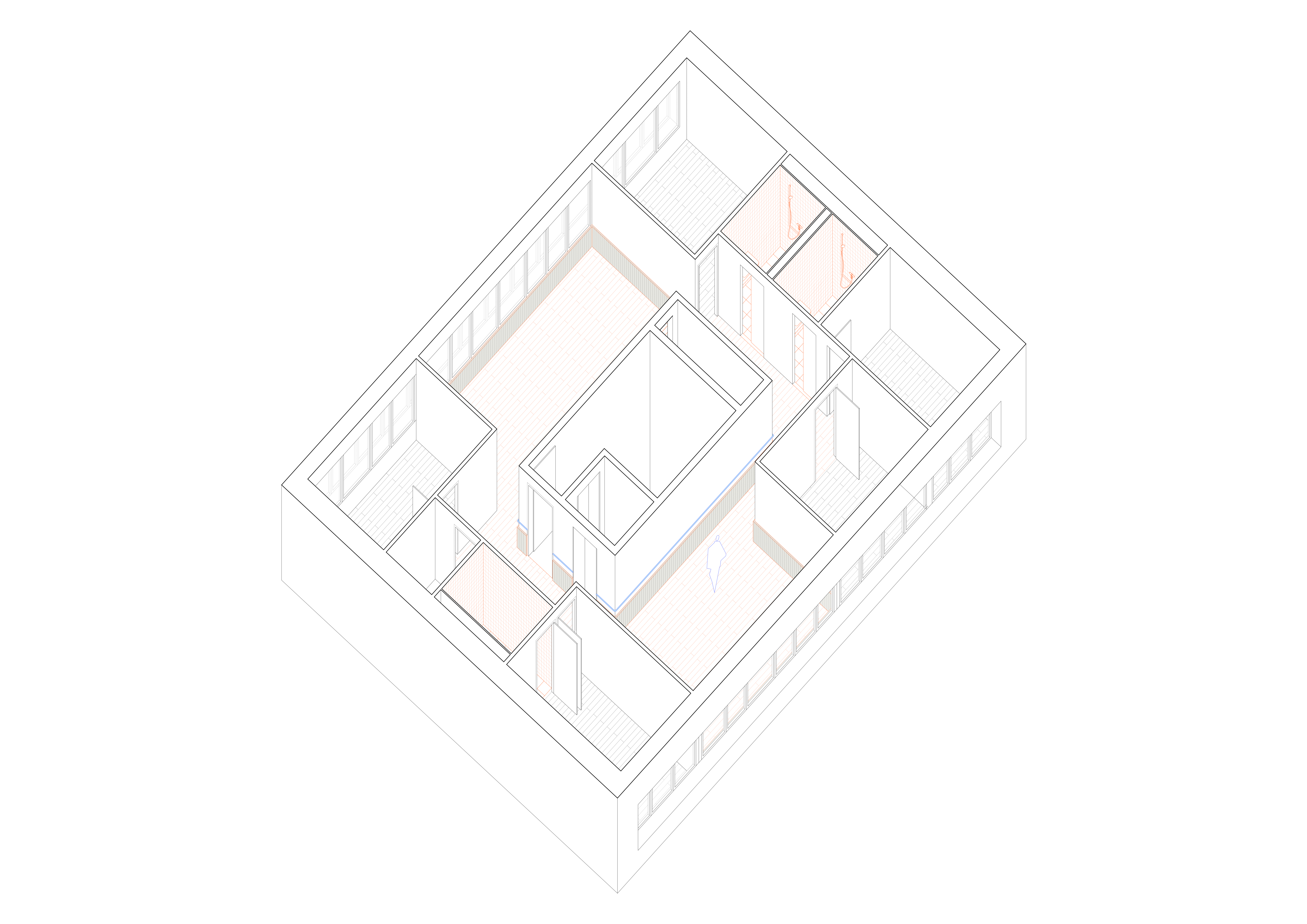 Gestalterisch liegt der Fokus auf der Verbesserung der Wohnqualität. In den vier Wohngeschossen wird überprüft, wie sich durch neue Boden- und Wandmaterialien sowohl die Raumakustik als auch die Wohnlichkeit spürbar steigern lassen. Zum Einsatz kommen akustisch wirksame Lamperien, ein geölter Eichenparkett und ruhige, unaufgeregte Farbwelten. Beim Farbkonzept wurde besonders auf die Bedürfnisse des beeinträchtigten Klientels Rücksicht genommen – klare Orientierung, geringe Reizbelastung und ein stimmiges Gesamtbild standen dabei im Vordergrund. Durch geringfügige strukturelle Anpassungen wird im fünften Obergeschoss ein neu konzipierter Wellnessbereich realisiert, der als ruhiger Rückzugsort Raum für Erholung und persönliche Auszeiten schafft.
